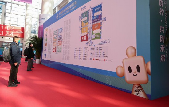 11月29日,链博会会场入口处的地图导引墙上印有吉祥物“链氪”的形象。